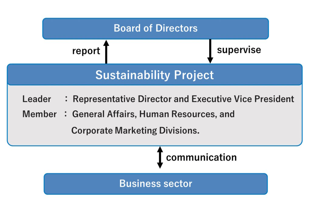 With regard to sustainability initiatives, a project team has been established under the leadership of Soma Yoshikazu, Representative Director and Executive Vice President with members from the General Affairs, Human Resources, and Corporate Communications Divisions. This project team is working to promote each of the various measures. They will be reporting on their progress to the Board of Directors, which supervises and approves the activity policy and status of the initiatives.